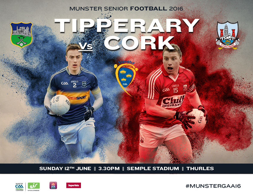 Cork will play Tipperary in the Munster Senior Football Championship Semi-Final on Sunday 12th June in Semple Stadium, Thurles @ 3.30pm. The games will preceded by the Junior game between Cork and Tipperary @ 1.30pm.