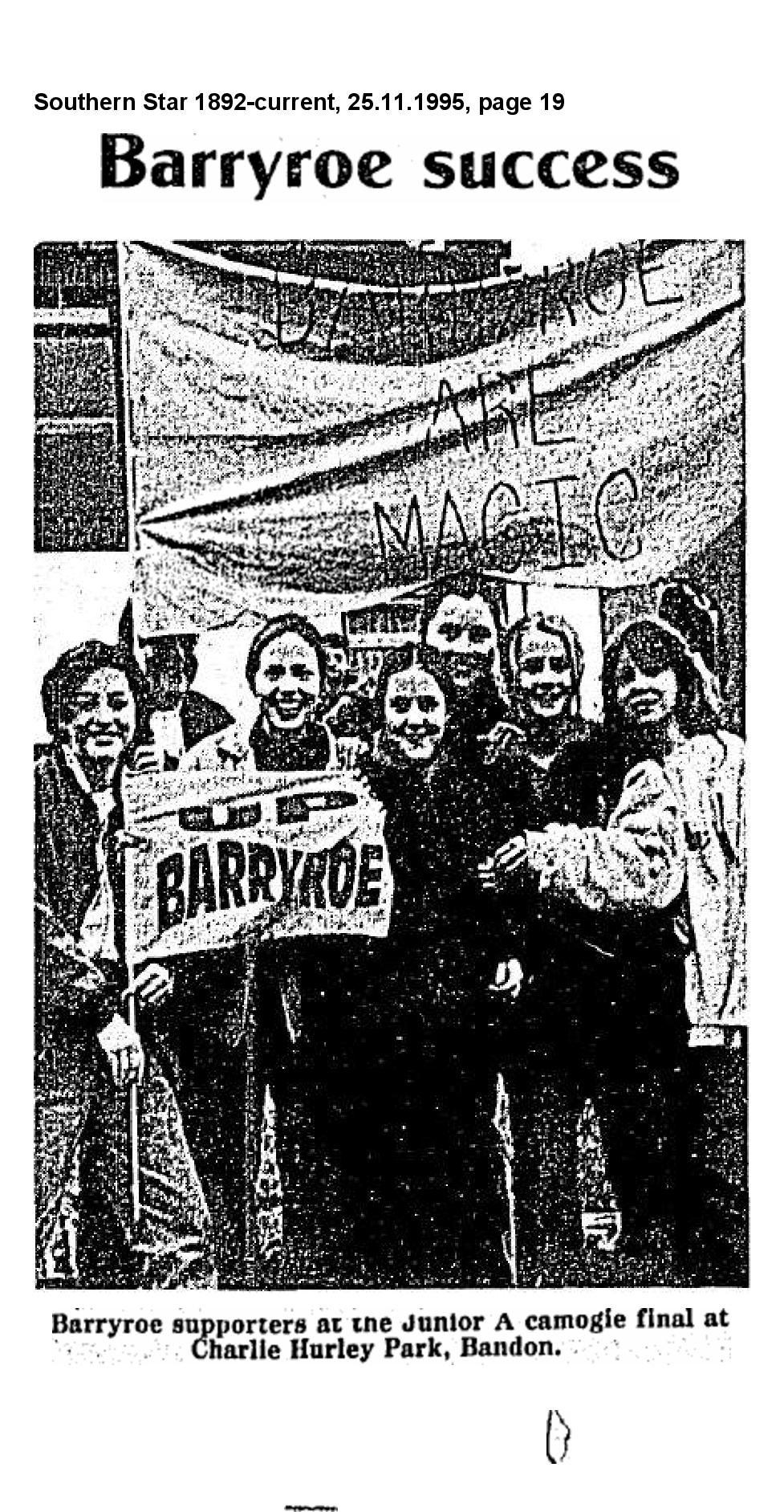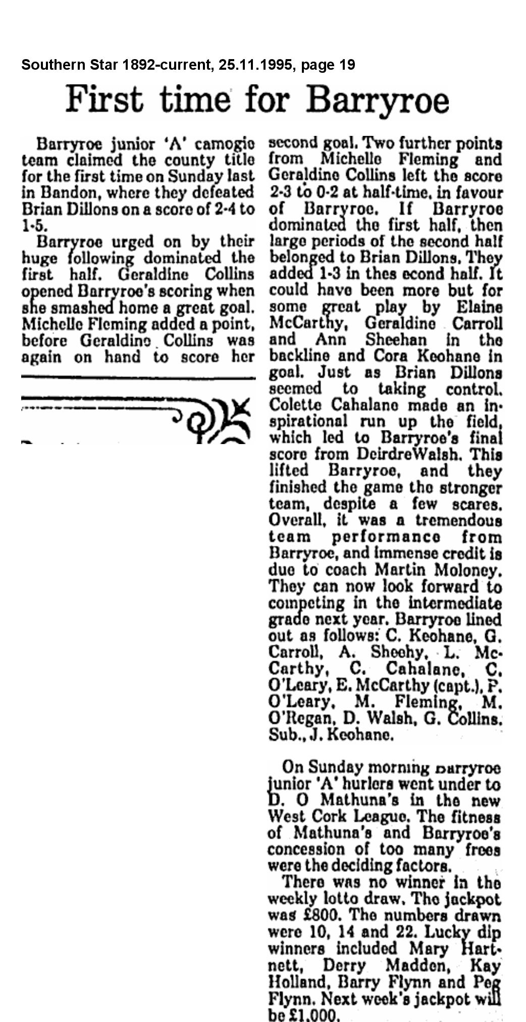 #onthisdate thirty years ago, the Barryroe Junior 'A' camogie team claimed the county title for the first time on Sunday the 19th of November 1995 in Bandon, where they defeated Brian Dillions on a score of 2-04 to 1-05.