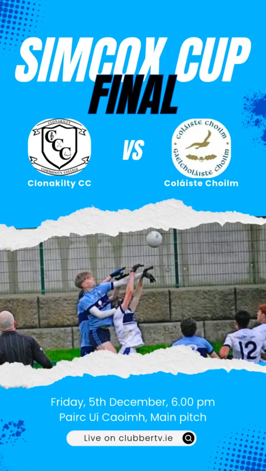 Best of luck to all the local lads involved with Clonakilty Community College as they take on Colaiste Choilm in the Simcox Cup Final this Friday at 6 pm in Páirc Ui Chaoimh. All support greatly appreciated.