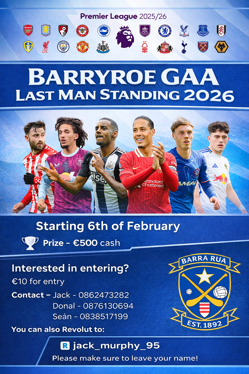 Barryroe GAA adult players are set to kick off an exciting Last Man Standing fundraiser, with the competition getting underway on February 6th. Entry costs €10, and participants will get the chance to claim a €500 cash prize. The popular format promises plenty of excitement as entrants are knocked out round by round.