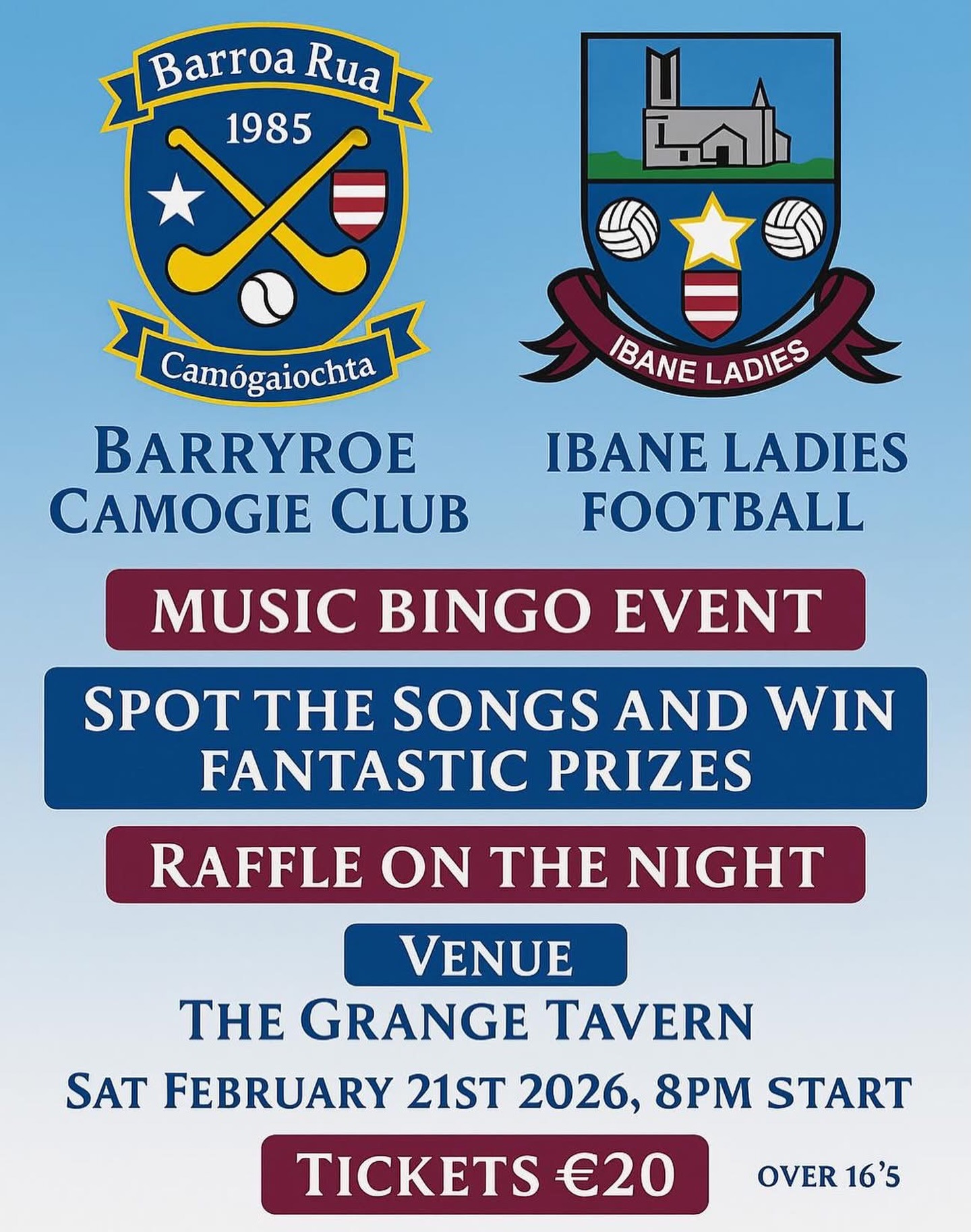 Barryroe Camogie Club & Ibane Ladies Football Club invites you to join in on a night of craic agus ceol as they host a music bingo fundraiser.