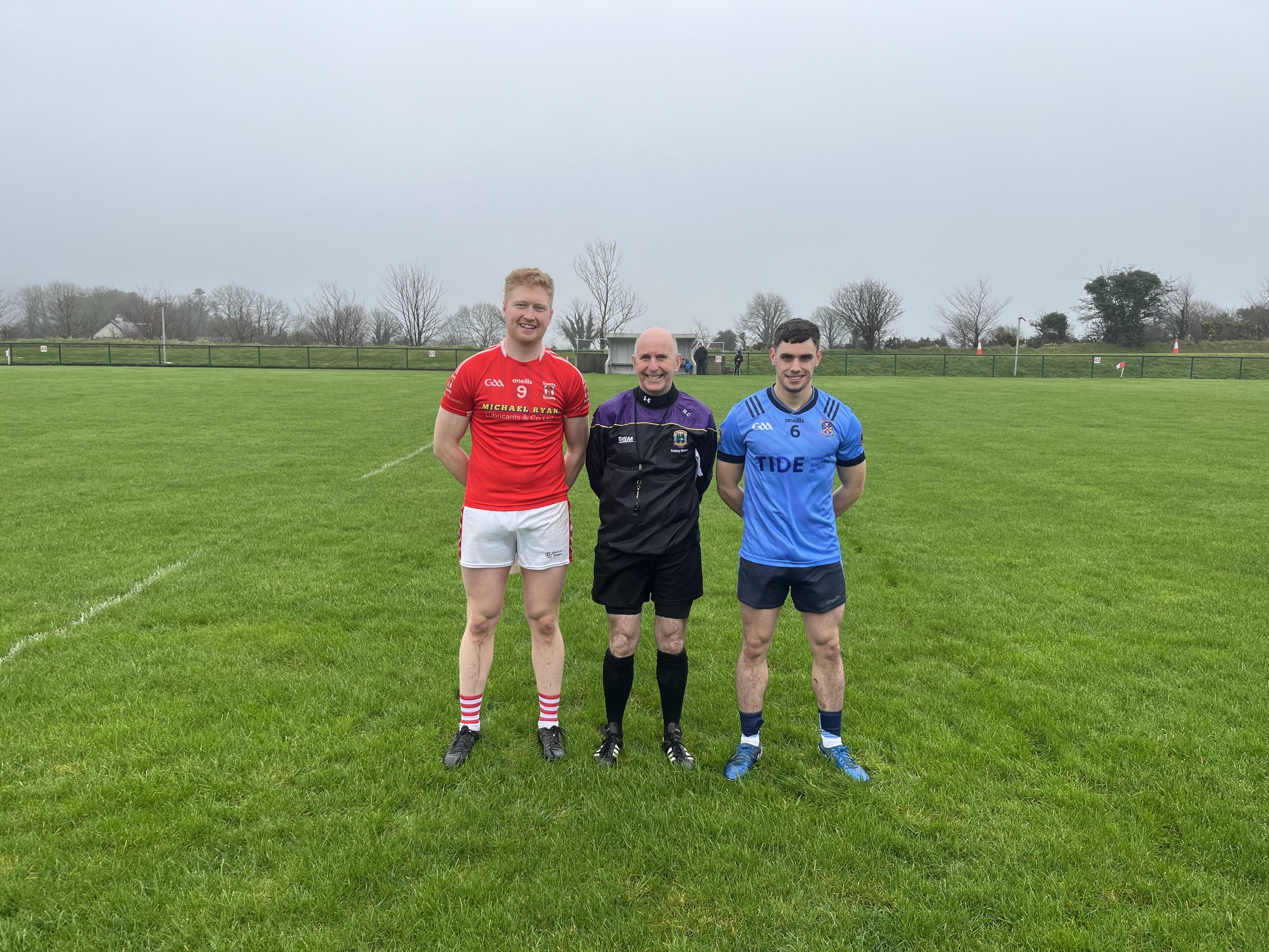 Ballinascarthy captain - Ciarán Nyhan, match referee - Michael Collins, Clonakilty and Barryroe captain Seán O'Riordan pictured before the game.