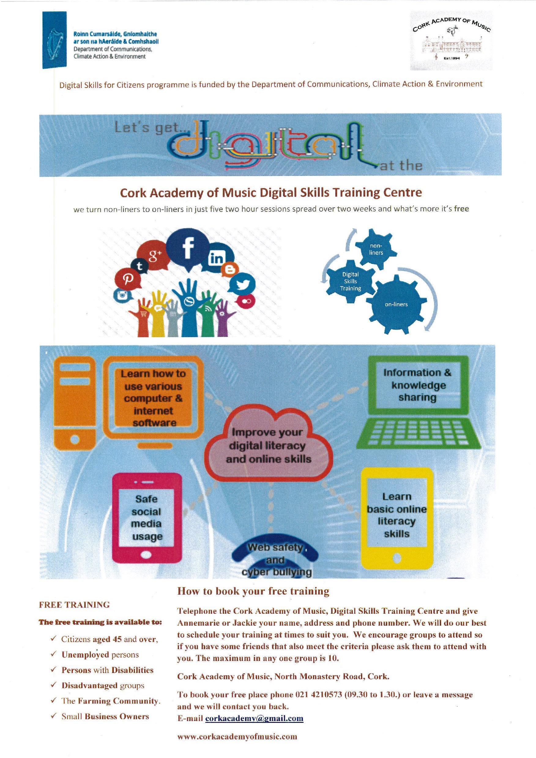 Find below information on a programme Getting Citizens Online currently being provided by Cork Academy of Music and it is funded through the Department of Communications Climate Change and Environment.